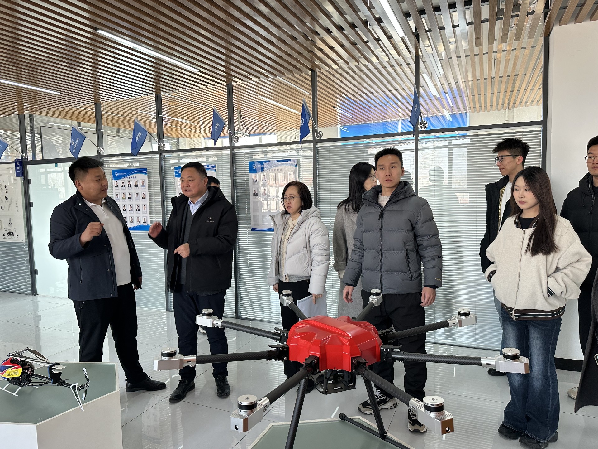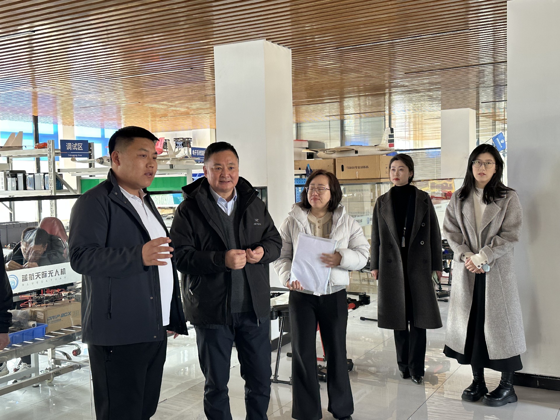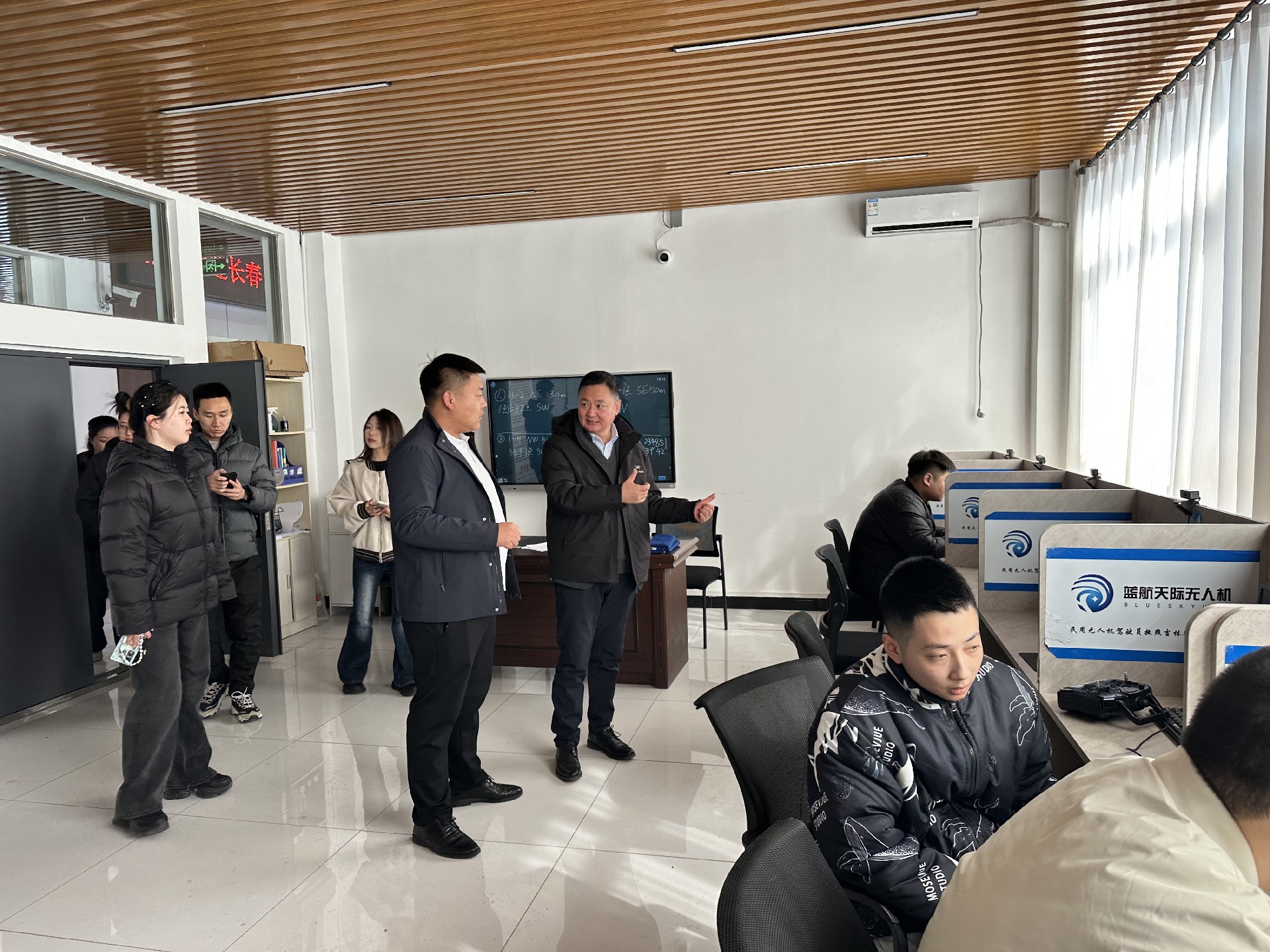 长春电子科技学院院校领导们参观了蓝航天际的无人机模拟飞行教室、学员实训区等核心教学场景,项目经理种法欣介绍了蓝航基地发展历程、办学资质、业务布局及行业成果。现场陈列专业配套教学器材、行业应用设备等,直观感受到蓝航天际在无人机配置上的硬核实力。